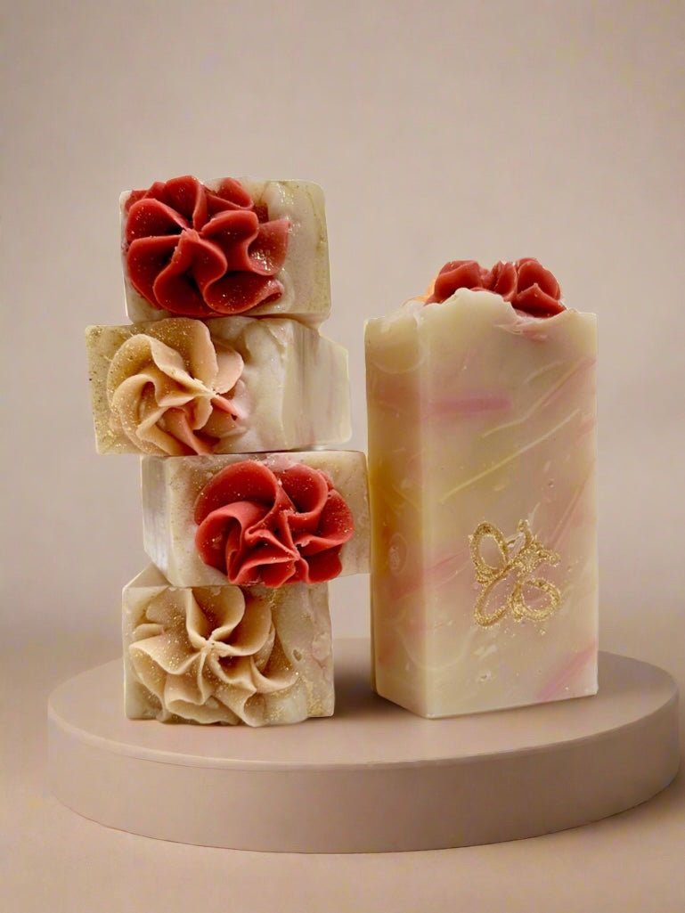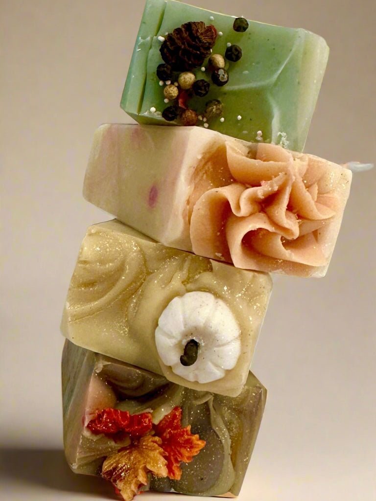 Una celebración floreciente: flores entubadas coronan este jabón festivo, inspirado en reuniones acogedoras y risas en la hora dorada. Brillante, acogedor y alegre.
