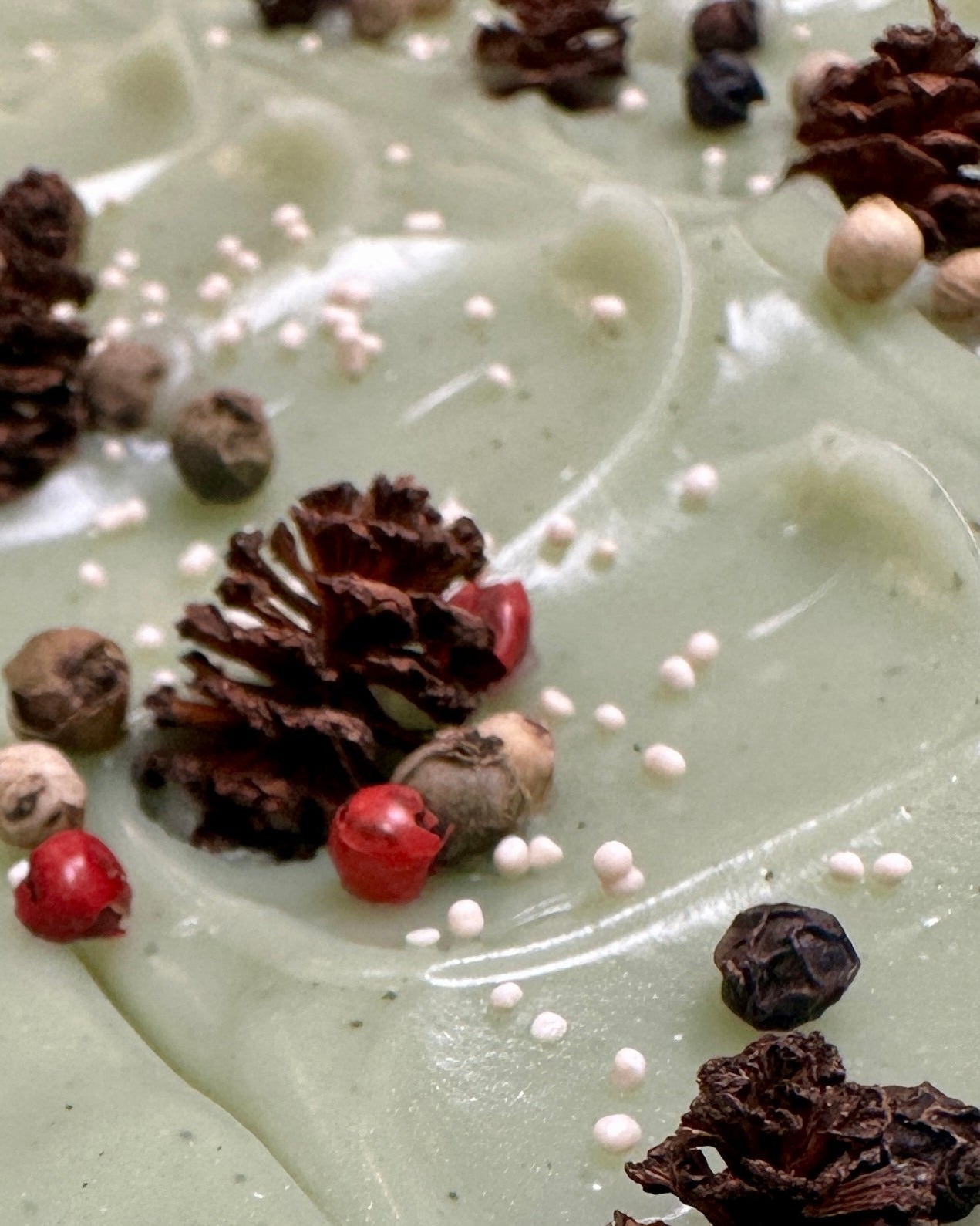 Espirales de color verde pálido y pequeñas piñas de aliso capturan la serenidad de un bosque en transición. Con notas de bálsamo, pino y cedro, es una bocanada de aire fresco y un momento de quietud. Retire la pequeña piña de aliso antes de usar.