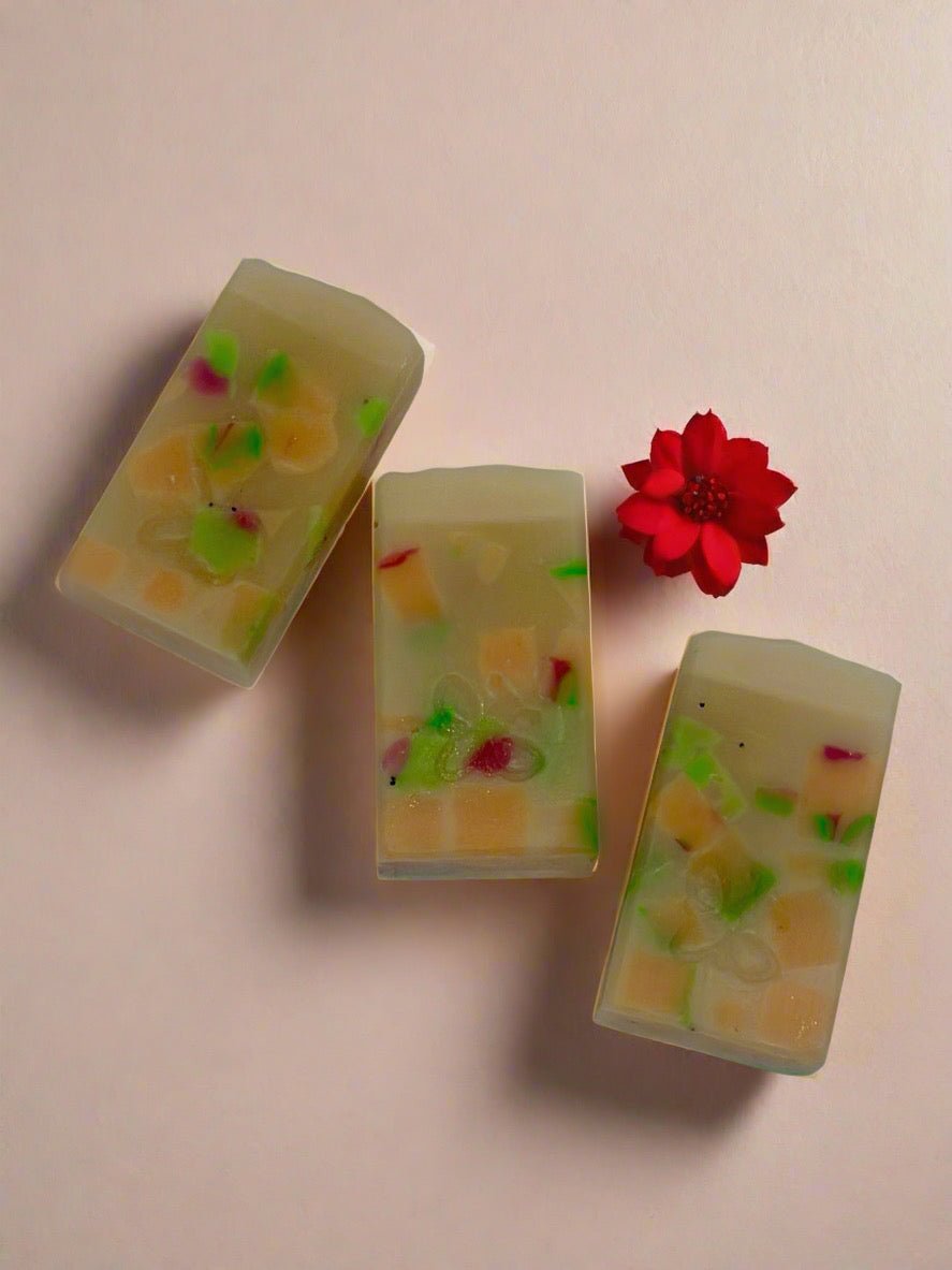 Oasis : Con reminiscencias de un oasis en el desierto lleno de hermosas flores de cactus, esta barra presenta un impresionante diseño de terrazo. Cada barra es única y desprende un ligero aroma cítrico dulce. Está rematada con un remolino texturizado minimalista.