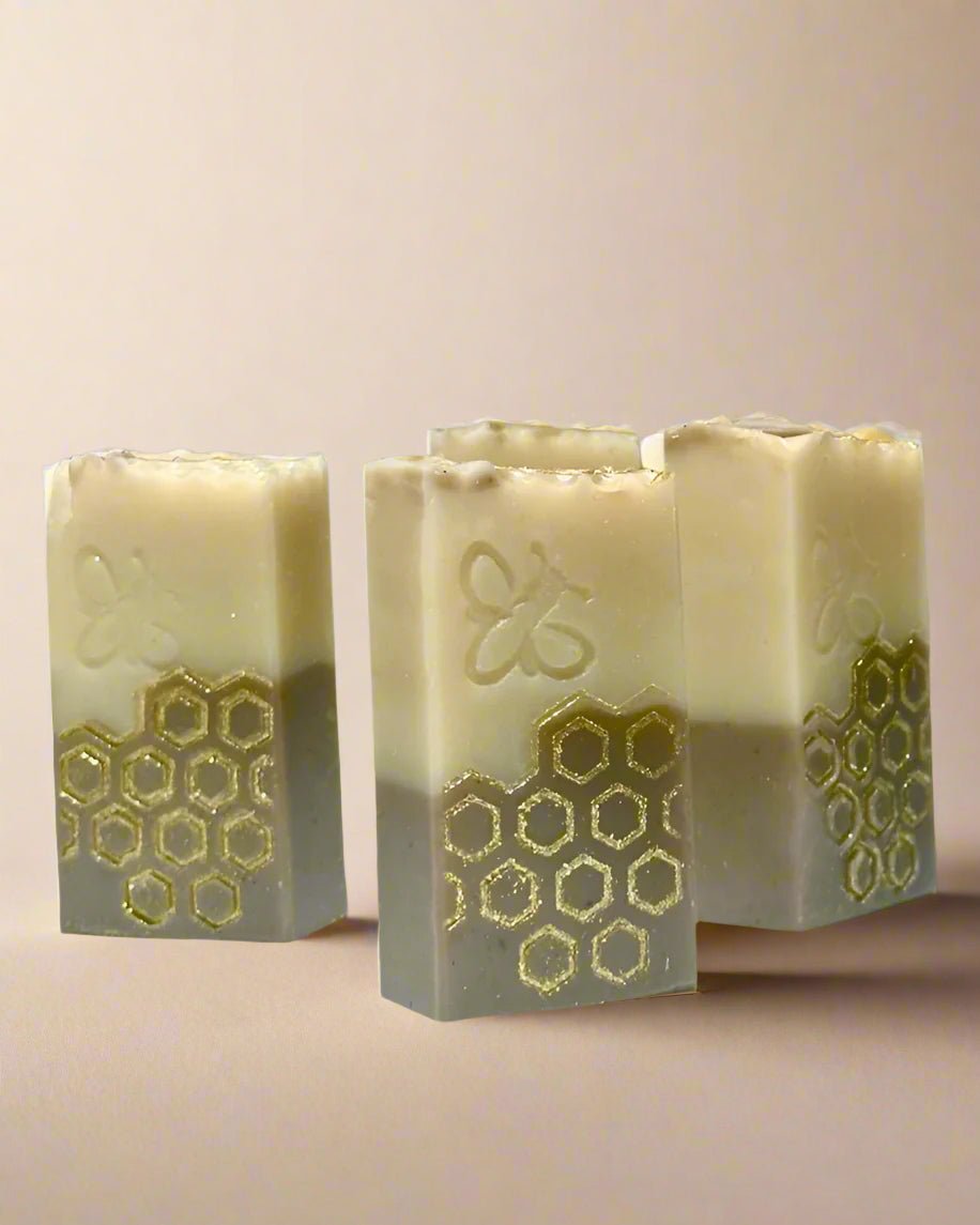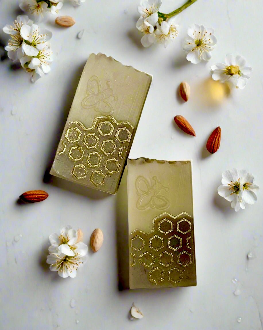 Honey Almond : These beautiful, layered bars feature a gold swirl with honeycomb pattern on top and honeycomb pattern with gold detail in on the face of check bar. Gorgeous and enriched with colloidal oatmeal then sweetly scented with sweet almond, they're almost too delicious to resist!